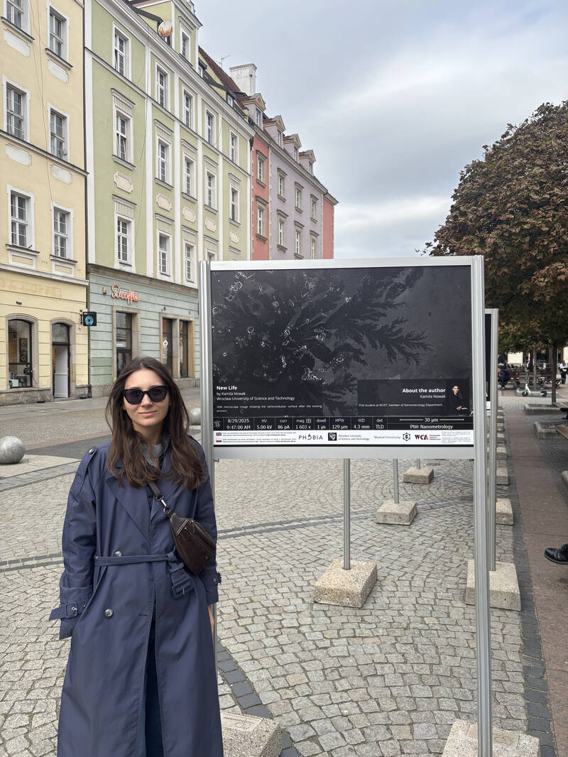 Praca naszej doktorantki Kamili Nowak została wywieszona w ramach wystawy MANIAC 2025, organizowanej przez PhoBiA PWr, na wrocławskim Rynku. Ekspozycja będzie dostępna dla zwiedzających do 30 września. Zdjęcie wykonane mikroskopem SEM przedstawia powierzchnię struktury półprzewodnikowej po procesie trawienia chemicznego.