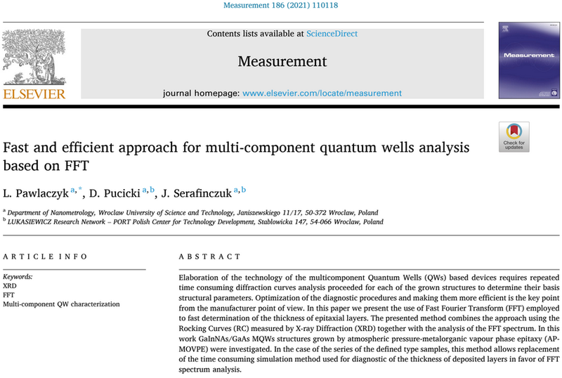 Gratulujemy Łukaszowi Pawlaczykowi, prof. Jarosławowi Serafińczukowi i prof. Damianowi Pucickiemu opublikowania pracy "Fast and efficient approach for multi-component quantum wells analysis based on FFT" wydanej w czasopiśmie Measurement (IF=3.9). Wszystkim życzymy dalszych sukcesów naukowych.